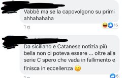 Alcuni commenti semplici come: “Godo forza Catania!”, ad altri molto più gravi come “Dovete fallire”, oppure: “Da catanese e siciliano non potevo augurarmi di meglio, spero che falliscano e vadano in Eccellenza”. “La ruota gira, godo bastardi”. Insomma non proprio parole dolci da parte dei cugini catanesi.