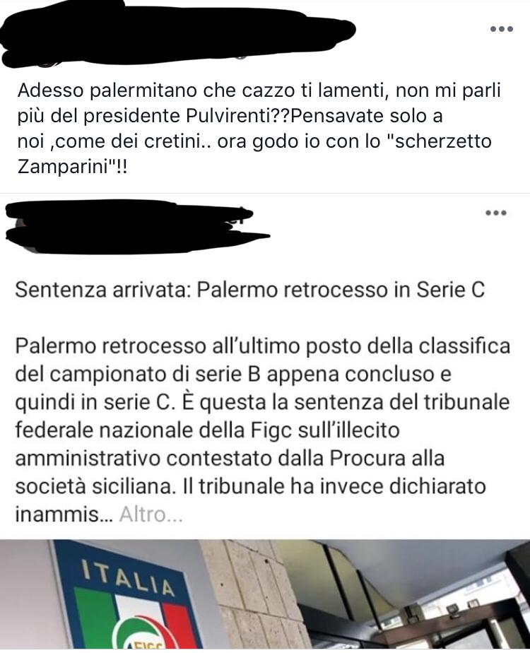 Non arriva grande solidarietà da Catania. Alcuni tifosi etnei stanno manifestando tutta la loro gioia sui social per la situazione giuridica del Palermo, che come è noto al momento è stato penalizzato con l’ultimo posto in classifica che vuol dire Serie C.