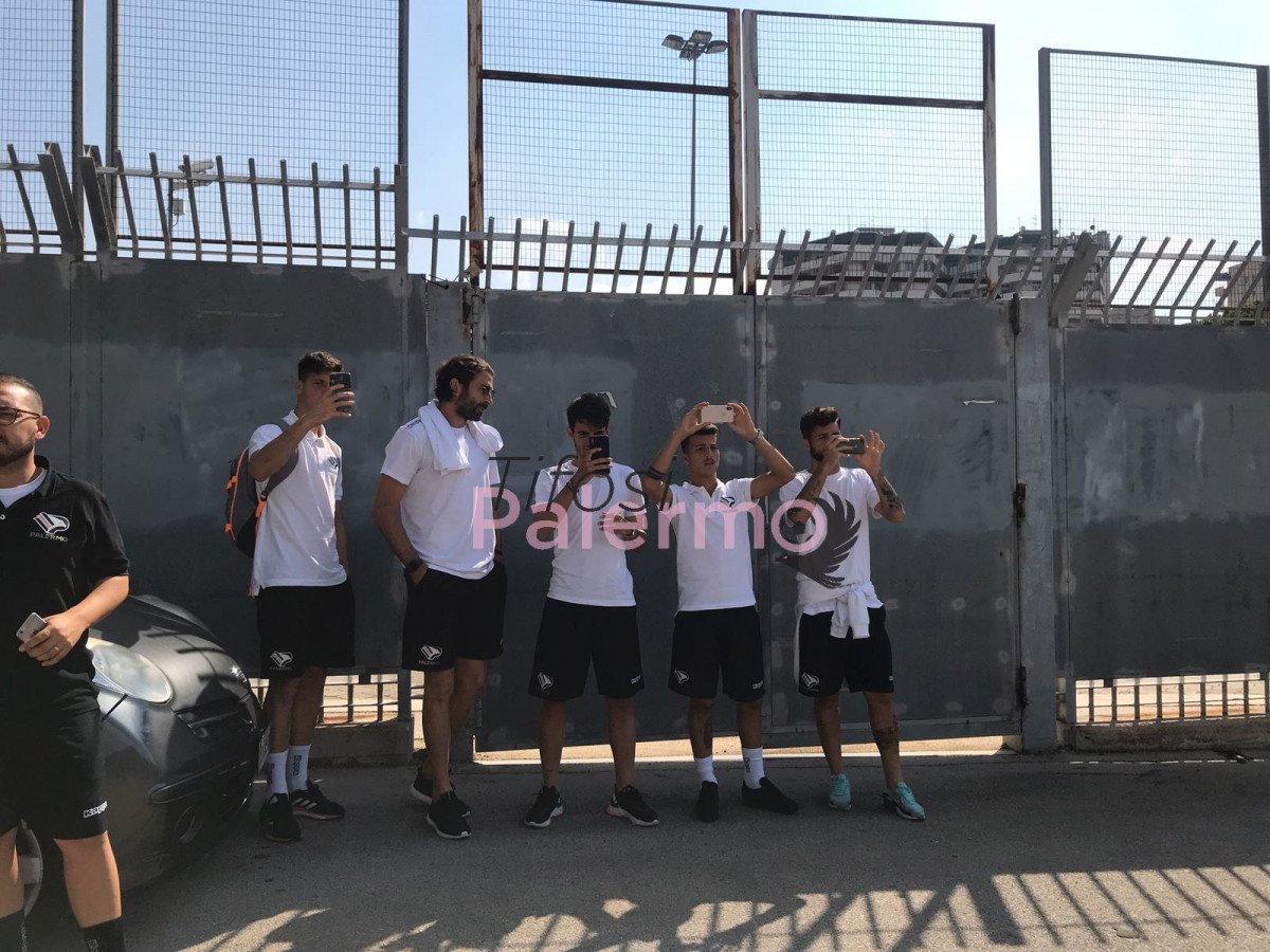 Il pubblico in delirio nel cortile del “Barbera”. Cori e grida che accompagneranno i rosanero fino a Biancavilla. Nel video sotto pubblicato si vede il pullman della squadra che parte verso la strada.
