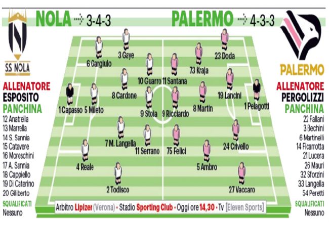 Sul Giornale di Sicilia, oggi in edicola, le ipotesi di formazione delle due squadre nella gara di questo pomeriggio a Nola.