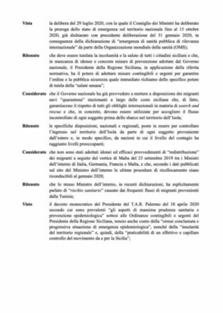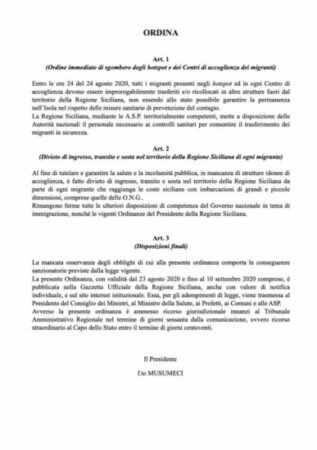 “L’Europa fa finta di niente e il governo nazionale ha deciso, malgrado i nostri appelli, di non attuare i decreti vigenti e di non chiudere i porti come invece ha fatto lo scorso anno con il decreto interministeriale Interno-Difesa-Trasporti.” Continua dicendo: “Vogliono far diventare razzisti i siciliani che sono il popolo più accogliente di tutto il mondo? Adesso se vogliono a Roma impugnino pure la mia ordinanza. Basta! abbiamo avuto fin troppo rispetto istituzionale su tale emergenza”.