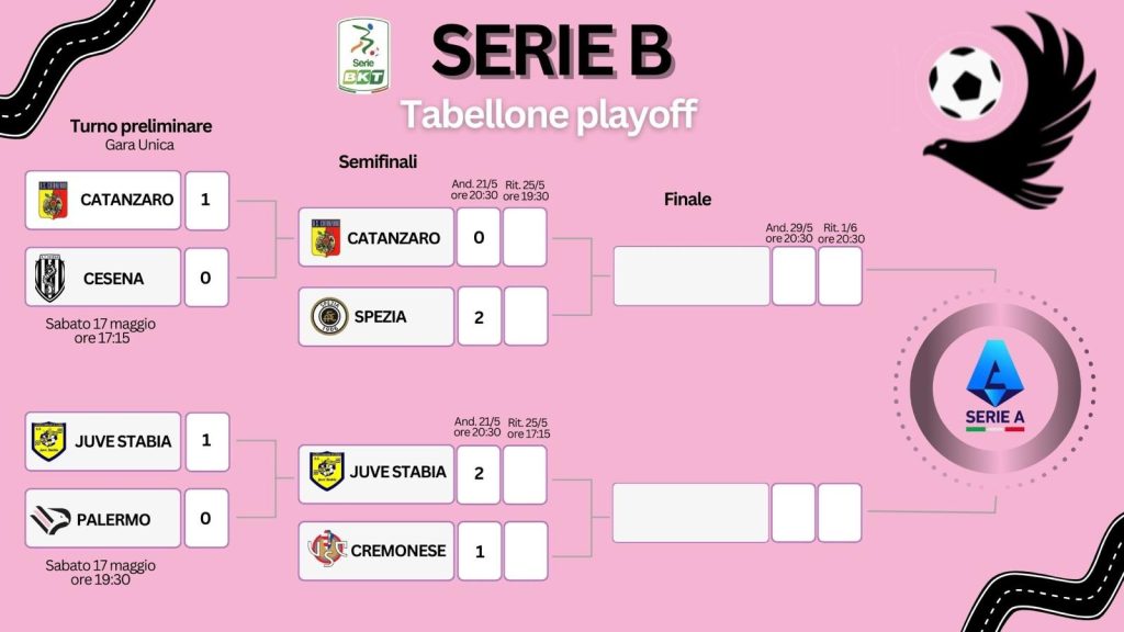 Tornano in campo Spezia e Cremonese, che dovranno sfidare rispettivamente Catanzaro e Juve Stabia. Gli spezzini, dopo un campionato di alta classifica, sono stati gli unici a minacciare il dominio di Sassuolo e Pisa, alzando bandiera bianca solamente nel finale di stagione. Adesso si giocheranno il ritorno in massima serie dopo due stagioni in queste quattro potenziali sfide che li separano dalla gioia della promozione: le prime due le giocheranno sicuramente contro la formazione di Caserta, abile a liberarsi di un Cesena arrembante che ha sprecato molto (tra cui un rigore con Shpendi) e che si è pienamente affidata al bomber Iemmello, decisivo anche nel match dello scorso sabato.