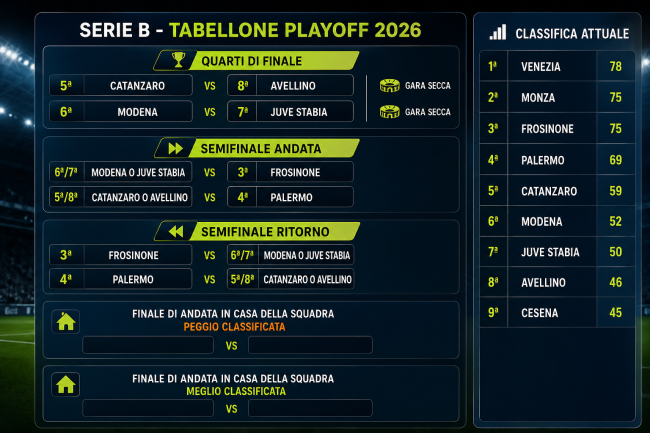 Le semifinali saranno invece in gare di andata e di ritorno (che si giocherà in casa della squadra meglio piazzata al termine del campionato). Ovviamente abbiamo dato il Venezia per primo classificato, visto il vantaggio ma nulla è scontato e tutto è rivedibile. Oggi la situazione, a 2 giornate dal termine, sarebbe questa: