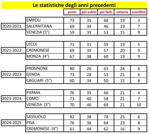 C’è una costante, qualche dato indicativo che si ripete con regolarità? Abbiamo fatto questo piccolo studio prendendo in considerazione gli ultimi 5 anni cioè dal campionato iniziato nel 2020 a quello appena concluso a giugno 2025. Ed abbiamo considerato le variabili più importanti: punti totali, gol subiti e gol fatti, vittorie totali e sconfitte totali in tutta la stagione. Abbiamo inserito anche la terza promossa, quella uscita dai playoff e per questa ovviamente abbiamo considerato solo i dati al termine della regolar season.